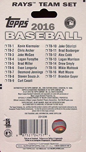 [Product Information]- This is a 2016 Topps Tampa Bay Rays Factory sealed special edition 17 card team set; cards are numbered TB-1 through TB-17 and are not available in packs. Players included are Kevin Kiermaier, Chris Archer, Jake McGee, Logan Forsythe, Brad Miller, Evan Longoria, Desmond Jennings, Steven Souza Jr., Curt Casali, Jake Odorizzi, Brad Boxberger, Alex Cobb, Logan Morrison, Drew Smyly, Mikie Mahtook, Matt Moore and Brandon Guyer.