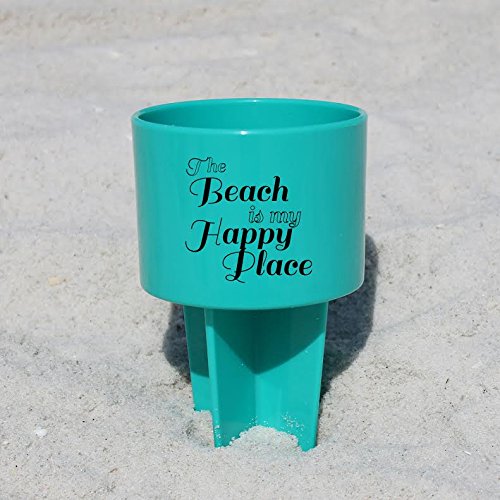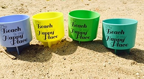 -. Feature : "The Beach Is My Happy Place" - custom design / Pack of 4 - Teal, Lime, Lemon, and Carolina Blue / Just spike it right next to you chair or towel - can hold your drink glasses, cell phone, or even sunscreen! / 8"H x 4"W x 3"D, Durable Heavy Duty Plastic / Share with friends & family