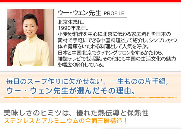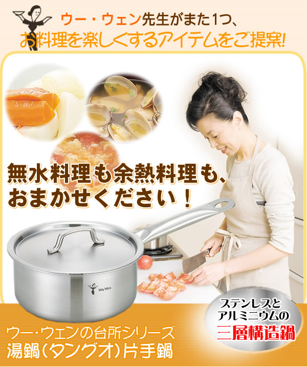 本体がステンレスとアルミニウムの全面3層構造の片手鍋!中心のアルミニウムが熱を素早くムラなく全体に伝え、両側のステンレスが熱を閉じ込めます。弱火や余熱の調理に最適です!サイズ/約直径18×深さ8.6cm  ※サプライヤー直送品 ご注文後、当日~1営業日後の出荷となります【商品名】ウー・ウェンの台所シリーズ 湯鍋(タングオ)片手鍋18cm