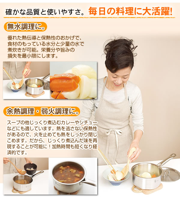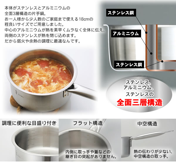 本体がステンレスとアルミニウムの全面3層構造の片手鍋!中心のアルミニウムが熱を素早くムラなく全体に伝え、両側のステンレスが熱を閉じ込めます。弱火や余熱の調理に最適です!