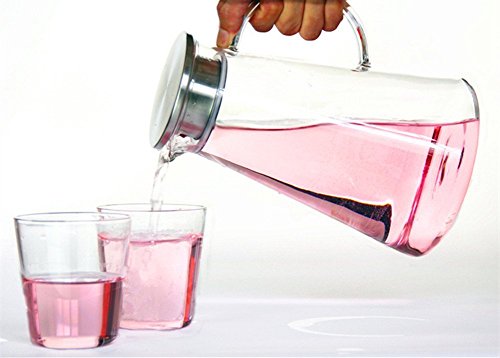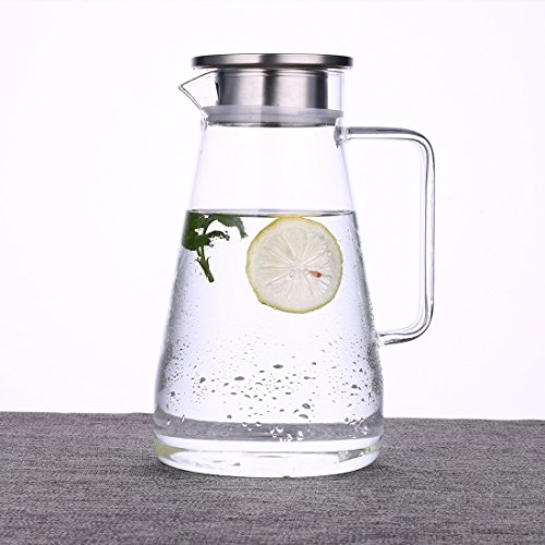 Studio : ShengYuanTai Publisher : ShengYuanTai Binding : Kitchen Product Description Glass Pitcher Carafe with Stainless Steel Lid, Juice Iced Tea Beverage Hand Made Water Jug. The glass pitcher allows you to easily make delicious, natural iced tea, giving you the freedom of choosing favorite ingredients. 1800ML Large Capacity, borosilicate glass, lead-free, stays clear and heat resistant. The pitcher has been designed in a simple, classic elegant shape - the size of which fits neatly into the fridge door. Large and capable pitcher perfect for parties, or just regular holder for beverages stovetop friendly. Size: 12.5*23.5(D*H), Net weight: 670G