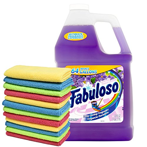 -. Feature : ALL PURPOSE CLEANER - The Fabuloso multi-purpose cleaner not only cleans thoroughly, it also leaves in its wake a long-lasting freshness that's bound to impress your friends and family. Concentrated in an easy-pour bottle, the Fabuloso cleaner is the only cleaner that the authentic homemaker will use. / IRRESISTIBLE SCENT - Lasting freshness that you can literally feel! The Fabuloso cleaner leaves no residue, just a long-lasting irresistible fresh lavender scent. It infuses the cleaned area with touchable freshness without leaving any residue, so there's no streaking or spots left behind. / SUITABLE ON MOST SURFACES - The multi-use Fabuloso cleaner cuts through dirt and grease yielding impressive results with minimal effort. The deep cleaner effectively works on most hard surfaces including stone, porcelain tiles and linoleum. Use it at home or in a commercial bathroom. / ABSORBENT MICROFIBER CLEANING CLOTH - Ultra soft, non-abrasive microfiber cleaning cloths, Cleans with or without chemical cleaners. Leaves lint and streak free results. Includes highly absorbent towels in assorted colors. Use together with the Fabuloso all-purpose cleaner for impressive results. / CONCENTRATED FORMUALA - Save space in your storage or supply closet with this concentrated formula. The concentrated liquid cleaner comes in a 1 gallon jug which can be reconstituted into 64 gallons. Separate this 1 gallon into separate bottles to put your whole team cleaning.