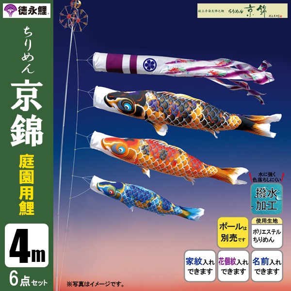 こいのぼり/鯉のぼり 庭園用(ポール別売りになります)(家紋入れ・名前入りは別料金になります)鯉のぼり 室内用 鯉のぼり ポール 鯉のぼり マンション 鯉のぼり 庭 園用 鯉のぼり 手作り 久月鯉のぼり 鯉のぼり ポール 鯉のぼり 徳永 取扱(セット内容)・吹流し4m・黒鯉4m・赤鯉3m・青鯉2m・矢車一式・ロープ20m鯉のぼり 献上手染友禅之鯉 ちりめん京錦。ちりめん京錦は、日本画家徳永春穂により錦鯉をモチーフに描いて誕生。黒鯉(真鯉)、赤鯉(緋鯉)の定義を覆し、黒鯉に赤や紫を配し、赤鯉や青鯉にも独特の色合いを使い本物の錦鯉を再現した画期的な鯉のぼりで大人気。鯉の王様錦鯉は現在、世界的に愛好家も多く大人気です。凝ったちりめん京錦鯉は、和の心を表現すちりめん素材を使用し、独特な風合いと重厚な色合いに仕上げ、その上にアルミ金箔を扇状に配しました。吹流しには吉兆柄の朱雀(不死鳥)を連想した縁起のよい鳳凰を色鮮やかに描き、雨水をはじく業界初の撥水加工仕上げ。撥水加工仕上げ生地は、従来品に比べ水はじきが強く、縮みやしわが少く、雨にも強く、撥水コーティング作用で一段と色あせも少く、鮮やかで丈夫な仕上りを実現した鯉のぼり