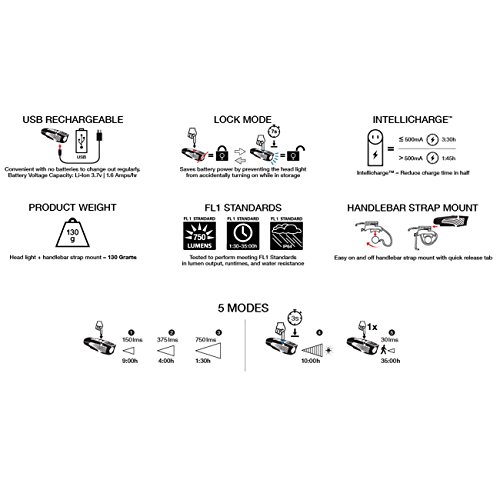 Studio : NiteRider Publisher : NiteRider Binding : Misc. Product Description The NiteRider Lumina Micro 750 Front Bike Light is versatile enough for both on-road and off-road cyclists and with plenty of brightness to go around.USB-rechargeable for convenient charging.Lock mode prevents activation during storage and transportation; simply press and hold power button for 7 sec..FL1 Standard IP64, dust and water resistant.System includes LED headlight, internal lithium-ion battery, handlebar mount and USB charging cable.Charge time: 1 Amp, 2 hours; 500mA: 3.25 hours.Battery life on high: 1 hour and 30 minutes.Battery life on low: 9 hours.Battery life flashing: 10 hours.Weight 4.6 oz.. 0