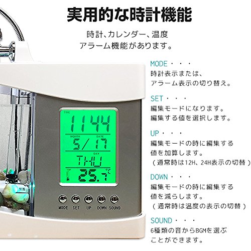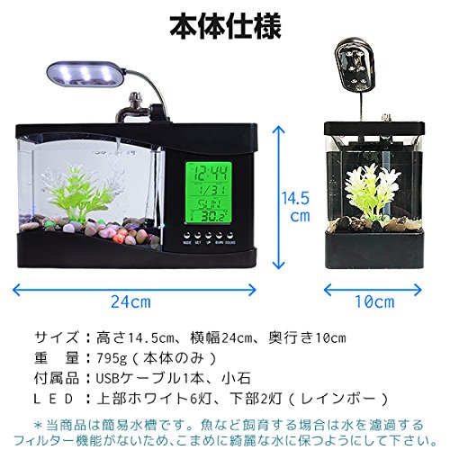 【特長】☂LEDライト、上部フィルターは共に省電力で、電気代約60%オフ(50Hzの場合)と省エネです。☂もちろん省エネなだけでなく、大変扱いやすいセットなのではじめての水槽の立ち上げにもぜひおすすめです。※40℃以上のお湯は注がないでください。※照明を水槽に取り付ける場合は、固定用のねじを緩めてから取り付けるようにしてください。無理に取り付けると破損の恐れがあります。☂電源はパソコンのUSBが使えます。または別売りの5V電源アダプタを利用します。(時計などディスプレイ機能は乾電池を利用します。別売り)☂新鮮な空気を注入するポンプがあるので、小さなお魚を入れて観賞用に楽しむことも可能です。(水は綺麗な状態に保って利用下さい)