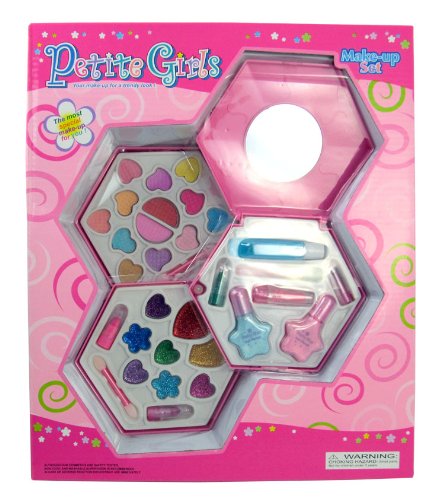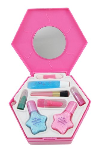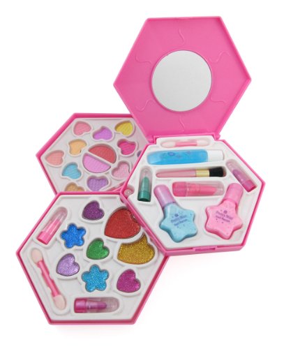Sun Hexagon Shaped Cosmetics Play Set - Fashion Makeup Kit for Kids Make-up palette that swivels into a compact heart carrying case. Everything a little girl needs for her very own makeup kit! Includes Glitter Makeup, Nail Polish, Makeup Case, Blush and more! Safety tested, non-toxic and washable. Ages 5 and Up
