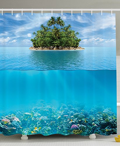 Underwater Shower Curtain Ocean Decor by Ambesonne, Reef Tropical Island Palm Trees and Artistic Photography Scene, Polyester Fabric Colorful Bathroom , 69x70 Inches, Aqua Blue White and Green