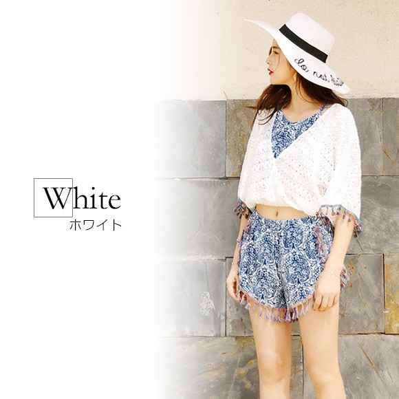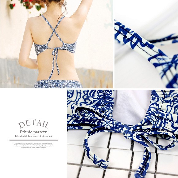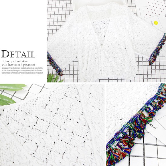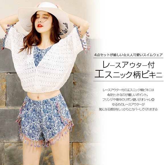 ◆商品紹介◆レースアウター付エスニック柄ビキニ4点セットです♪フリンジや背中のリボン使いがオシャレ☆ 露出少な目のビキニやカーデが気になる部分をしっかりと隠してくれ、オトナの女性も安心して着こなせるビキニです♪◆モデル◆・身長158cm・Mサイズ着用※お客様の体型や身長により写真のモデルとの着用感に多少の違いが出る場合がございます。◆素材◆ポリエステルとポリウレタン◆サイズ詳細◆※サイズ詳細は平置きで測った際のサイズとなっておりますので多少の誤差(約2-3cm)は予めご了承下さい。M/L/XLブラアンダー:約58-60cm/約60-63cm/約63-66cmショーツウエスト:約57-62cm/約62-64cm/約64-66cmカップサイズ(目安):B・C・D・E※画像の色味はお使いのパソコンやスマートフォン等モニター環境により実際の色味とは若干異なる場合がございます。