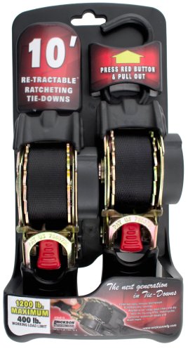 - Feature : Simple and smart retractable ratcheting system / Unused web is stored in center so it does not flap in wind or get dirty / Heavy vinyl-coated hooks prevent scratching / Contains two 1" x 10' long, black webbed, durable straps / 1200 pounds load capacity and 400 pounds working load limit