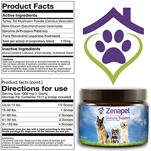 💙TAKE A LOOK AT WHAT'S INSIDE ZENAPET - Zenapets ingredients contain food form vitamins that help improve your dog's immune support. Containing vitamin B-1, B-2, B-6 to A,C, D, and E you can help your dog feel good and reach maximum health. Using just 4 plant based and nutritional ingredients both ancient and modern (turkey tail mushroom powder, beta-glucan, spirulina, resveratrol) combined create an unstoppable formula proven to support health.