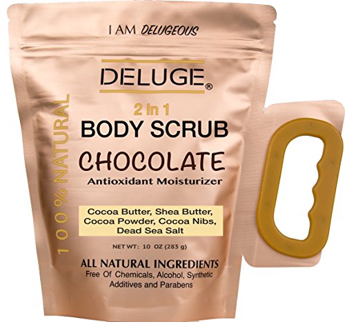 -. Feature : Antioxidant Properties: With antioxidant properties that can also help to protect your skin against wrinkle-causing skin da / Firms the skin - The caffeine present in chocolate stimulates the circulation and improves blood flow. This in turn improves and invigorates skin cells, decreases the aging process and increases firmness of the skin. / Moisturizing agent - Our richest Chocolate body Scrub from DELUGE contains high amounts of natural oils and emollients necessary for treating dry, rough and flaky skin. Helps to boost your skin's moisture content and stimulate cell renewal. / Good for cellulite - helps burn fat and get rid of cellulite. / Calming effects - Who hasn't calmed down after biting into a chunk of chocolate? In much the same way, a chocolate massage helps reduce stress and tension and eases tight and sore muscles.