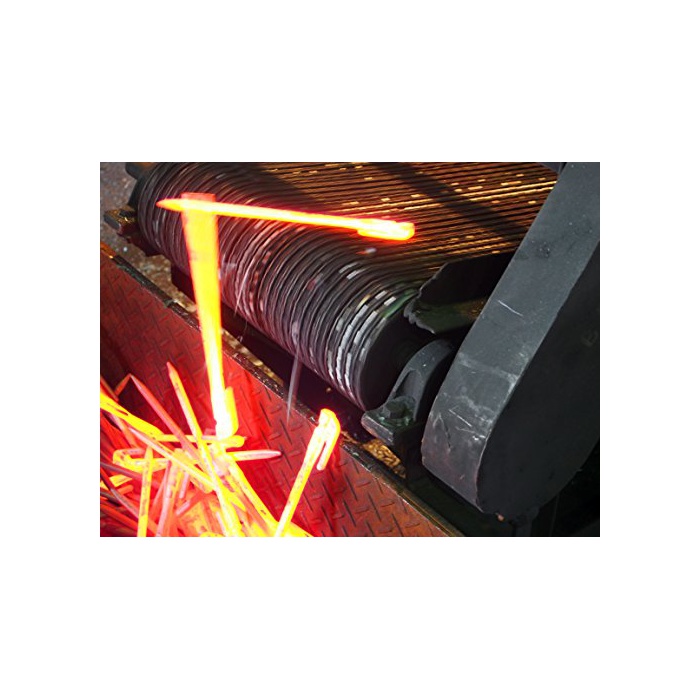 소재가 둥근 강재를 약1100℃가 되까지 새빨갛게 뜨거워지고, 약1톤 이라고 하는 강력한 힘으로 단번에 단면을 타원형으로 으깬 단조 페그(말뚝).가열한 강재에 강력한 압력을 더하는 것에 따라,우수한 강도를 가지는 페그(말뚝)가 완성합니다.