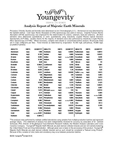 -. Binding : Health and Beauty -. Feature : Our bodies need a steady stream of minerals, many in trace amounts, to function properly. Plant Derived MineralsTM are liquid concentrates containing up to 77 minerals from prehistoric plants in their unaltered colloidal form. -. IsAdultProduct : 0 -. Label : Youngevity -. Manufacturer : Youngevity -. PackageQuantity : 5 -. ProductGroup : Health and Beauty -. ProductTypeName : HEALTH_PERSONAL_CARE -. Publisher : Youngevity -. Studio : Youngevity -. Title : MAJESTIC EARTH PLANT DERIVED MINERALS - 32 FL OZ, 5 Pack