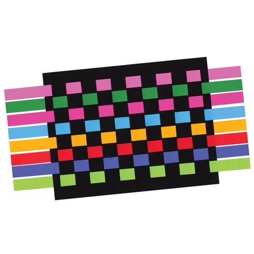 This kit includes 25 sheets of 80# tag board (8.5" by 11") and 250 pre-cut paper strips (3/4" wide by 16" long), 25 each of 10 different Rainbow Brights colors. The black paper is solid ... you cut the slits as needed. This is a low-cost and convenient way to introduce weaving activities. This preschool activity was developed by Friedrich Froebel for the Kindergarten, but long ago lost its connection to his original educational intent. Children will build eye-hand coordination and early math skills through the over/under patterns of paper weaving. Made in USA. 0 |