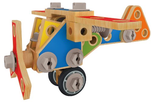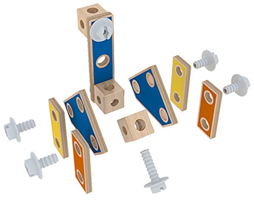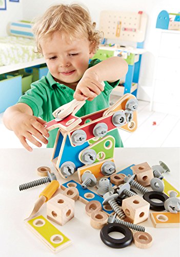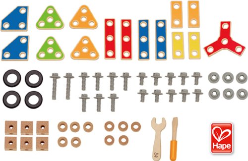 Little builders, ready your screwdrivers! The Master Builder Set inspires budding carpenters to build bigger and better than ever before. Each of the 62 pieces connect to construct an endless variety of contraptions with this best-selling, innovatively designed building set, providing children hours of entertainment. Consult the included building guide for ideas, invent new and unique structures, or design your masterpiece as you go along. Encourages development of coordination, fine motor skills, and creative thinking. Made from wood sourced from environmentally sustainably sourced forests. Durable child-safe paint finish and solid wood construction make this a toy your child will love for years to come. Hape's toys stimulate children through every stage of development and help nurture and develop their natural abilities. All Hape products sold in North America meet or exceed all applicable safety standards. The Master Builder Set is a proud recipient of the 2013 Parents' Choice Recommended Award.
