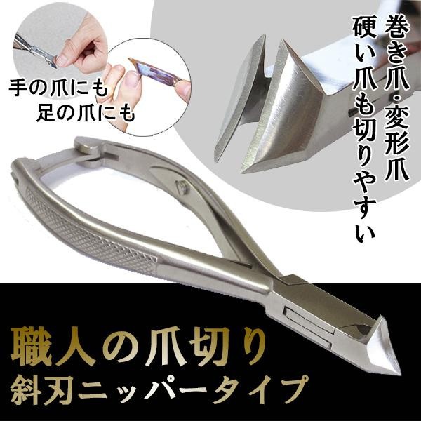 巻き爪や硬い爪、変形爪などもカットしやすいニッパータイプの爪切り♪左右どちらの手でもご使用頂けます。 製造国:日本 素材・材質:ステンレススチール 商品サイズ:約5.2×1.6×14cm 重量:約103g ※サプライヤー直送品【商品名】職人の爪切り 斜刃ニッパータイプ 56848