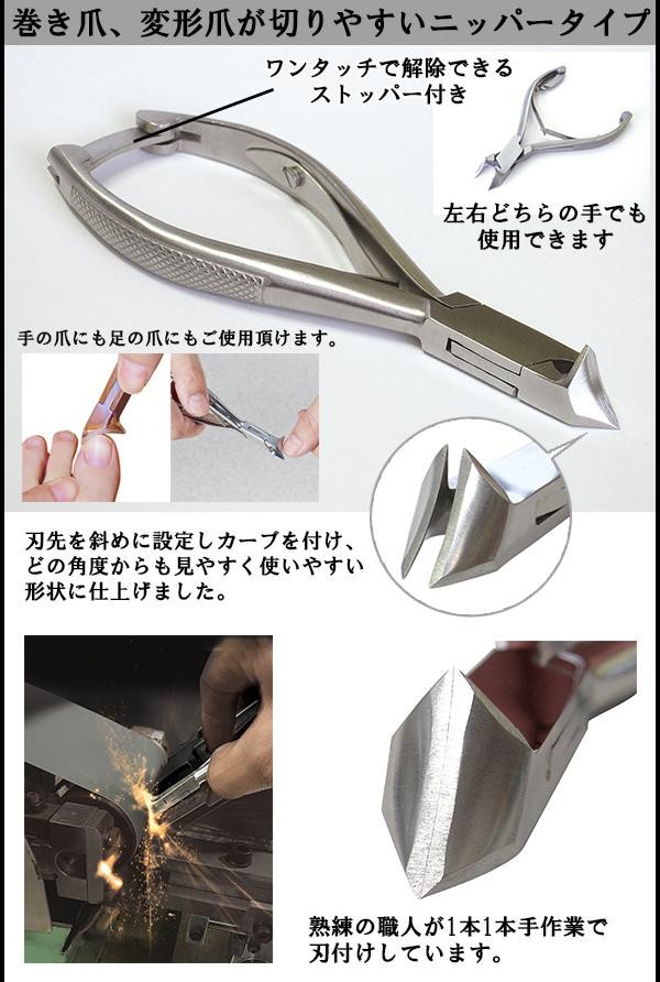 巻き爪や硬い爪、変形爪などもカットしやすいニッパータイプの爪切り♪左右どちらの手でもご使用頂けます。