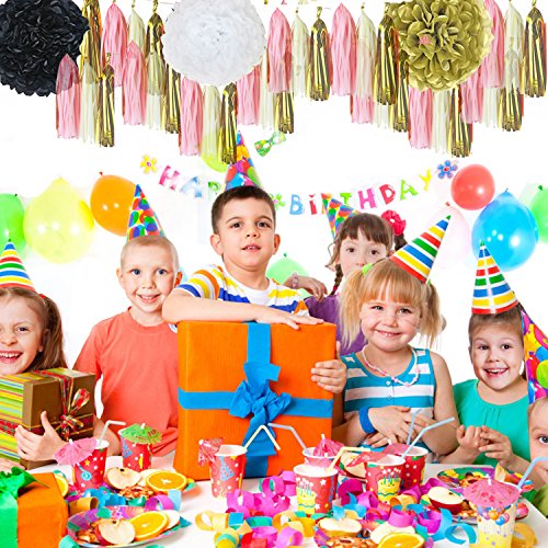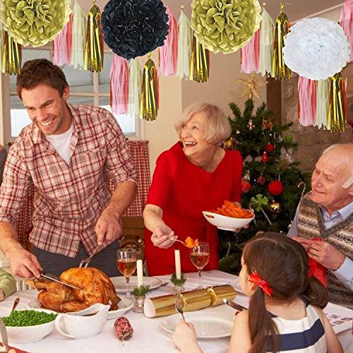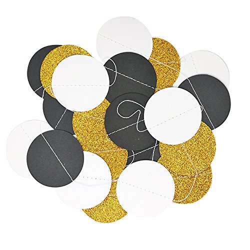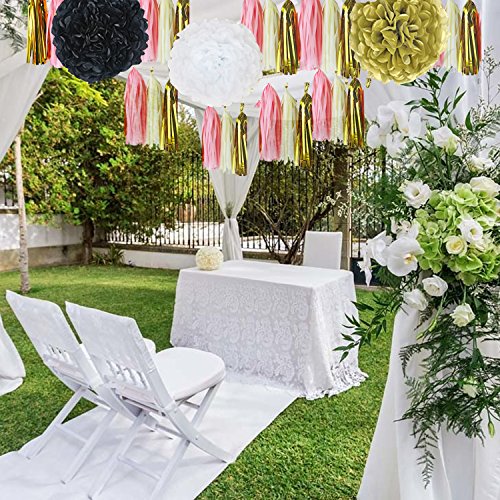 - SIZE & COLOR: Tissue paper flowers have 2 sizes: 3* 10", 3 * 12" in 3 different colors: black, white and gold. Paper tassel garland: 1 pack of 12 pcs in white, black, gold mixed color, each color comes with 4 pcs.Each tassel is about 14" long after assembled,2 pcs circle paper garland, diameter is 2.1" in white, black, gold glitter mixed color.