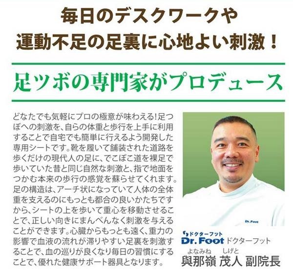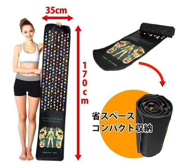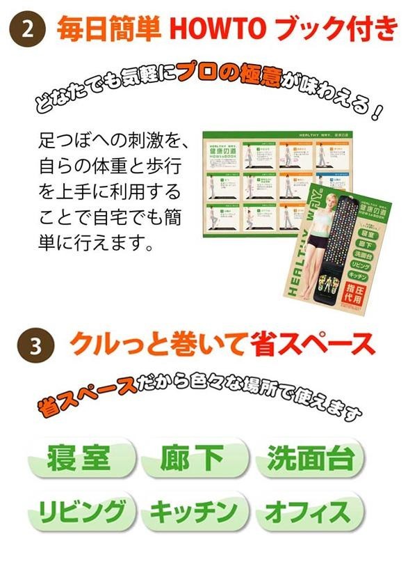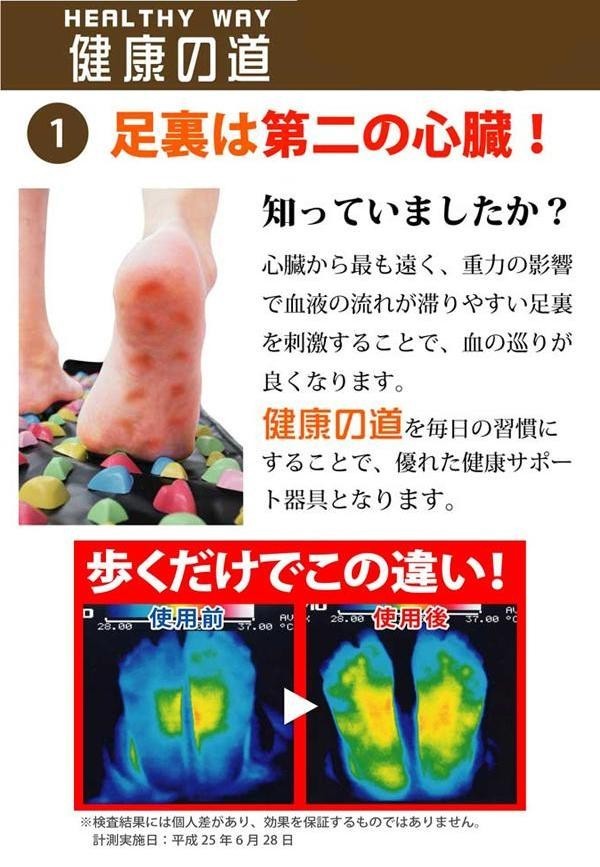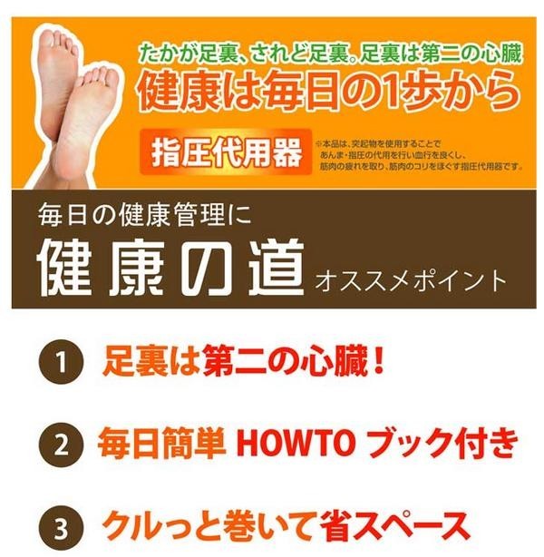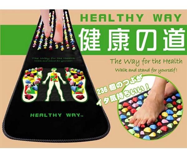 | 足裏は第2の心臓とも呼ばれています。「HEALTHYWAY健康の道」は、突起物を使い、あんま、指圧の代用を行い血行を良くし、筋肉のコリをほぐす指圧代用器です。毎日の健康チェックと健康増進を行いましょう。 |