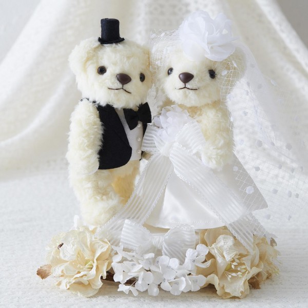 大きなヘッドドレスがポイントの繊細で可憐なイメージのウエディングベアと小さなお花のモチーフがドレスを飾るかわいらしいイメージのウエディングベアです。便利なぬいぐるみ針入り、ボアはカット済みです。 |