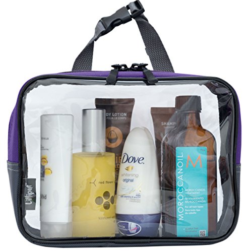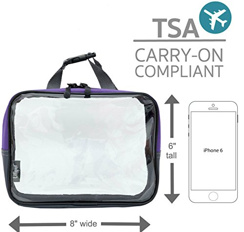 The Lilliput Clear Travel Cube is a one-compartment quart-sized toiletry bag with clear front and back panels. It features a webbing strap-buckle clip handle so you can hang it on a towel rack, shower rod or anywhere you need. With sizes of 8"x 6"x 3" it's specifically designed with TSA requirements in mind and it conforms with the 3-1-1 Liquids Rule program, thus working great as a carry-on toiletry bag for your 3.4 oz (100ml) travel size containers.