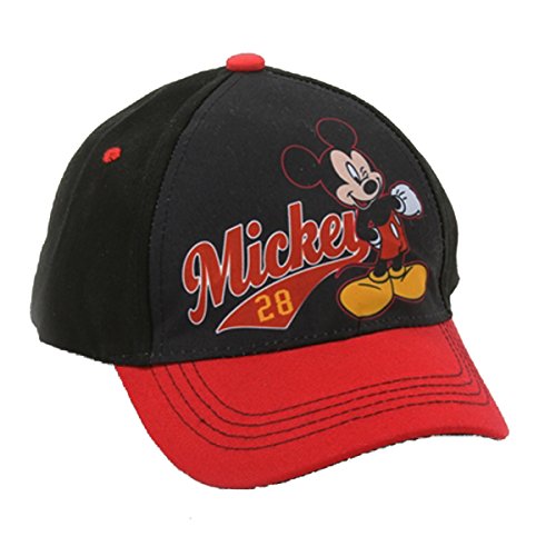 Product Description Little boys (toddler) will love wearing this Mickey Mouse baseball hat. It is black and red. Adjustable SNAP BACK strap at the back. ONE SIZE TODDLER 0