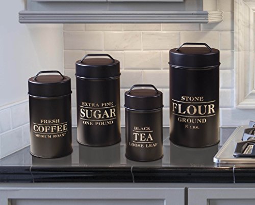 - · Canister dimensions: Flour: 10 5/8" x 5/14" Sugar: 9 1/2" x 4 3/4" Coffee: 8 1/2" x 4 1/4" Tea: 7 1/4" x 3 3/4"