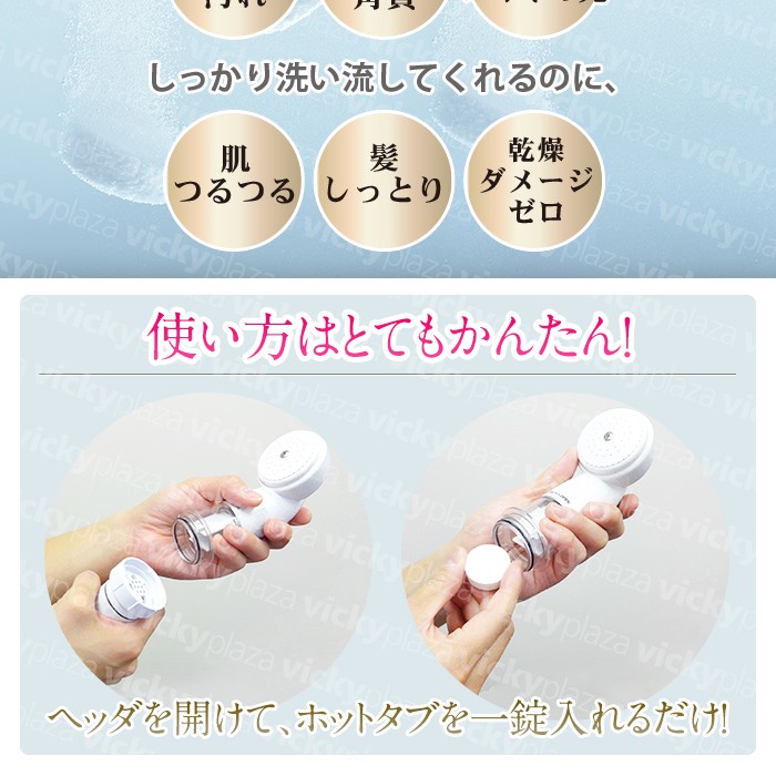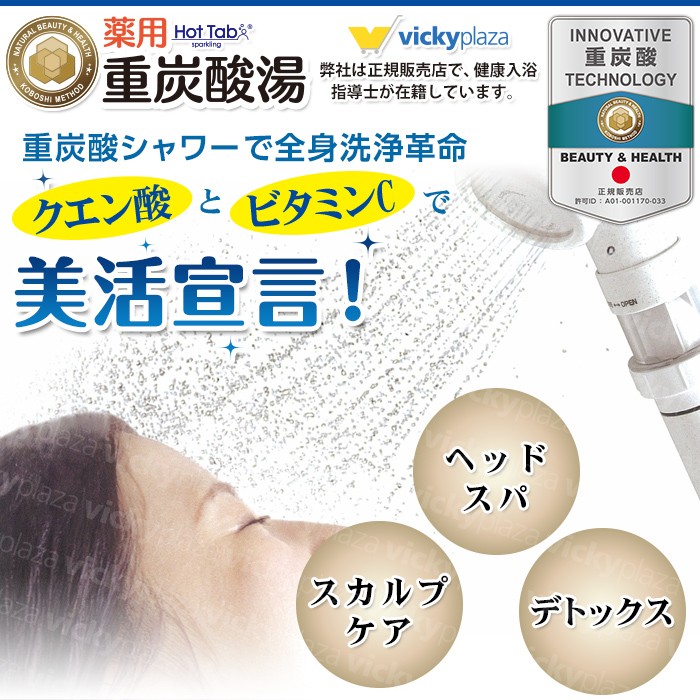 本格炭酸ヘッドスパを楽しめる、ホットタブ専用のシャワーヘッドです。シャワーなら夏でも気軽にホットタブをお使いいただけます。シャンプーを使用しなくても埃、汗、脂、整髪料などの汚れをしっかり洗い流します。重炭酸イオンがしっかりと毛穴の汚れ、老廃物を取り除き、血行促進。髪本来の持つハリ、ツヤ、サラサラ感を取り戻します。肌への刺激がない柔らかいお湯になるので、お肌の弱い方や、赤ちゃんでも安心してお使いいただけます。取り付けは簡単!ワンタッチでタブレットホルダーに錠剤が装着でき、溶け具合を確認することができます。1錠で7~8分お楽しみいただけます。※ホットタブを使用しない場合、美容効果は得られませんが、通常のシャワーヘッドとしてお使いいただけます。※洗髪にご使用される場合は、シャンプーは不要です。リンスも不要ですが、気になる方は毛先のみリンスで整えてください。■サイズ  約 全長277mm、最大幅60mm■重量  約 165g■材質  ABS樹脂■耐熱温度 0℃~60℃■生産国  日本製■付属品  アダプターセット3個(取付用アタッチメント:KVK、ガスター、MYM)、取り付け用リング、取扱説明書■入数    1個