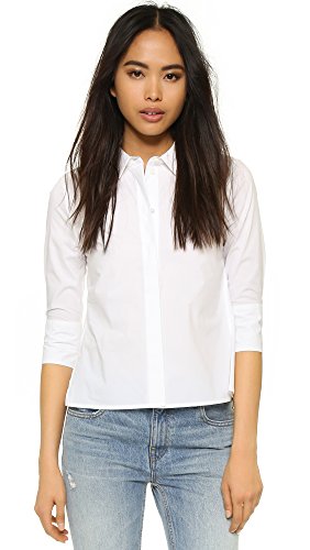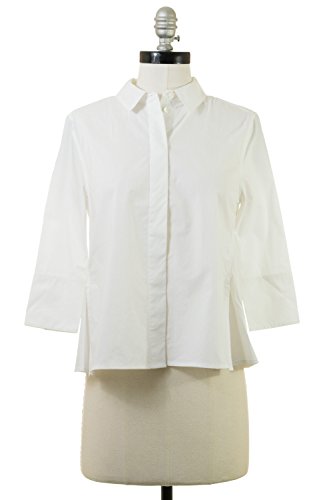 A crisp, cropped Equipment blouse with a split hem. Fold-over collar and hidden-button placket. 3/4 sleeves and button cuffs.