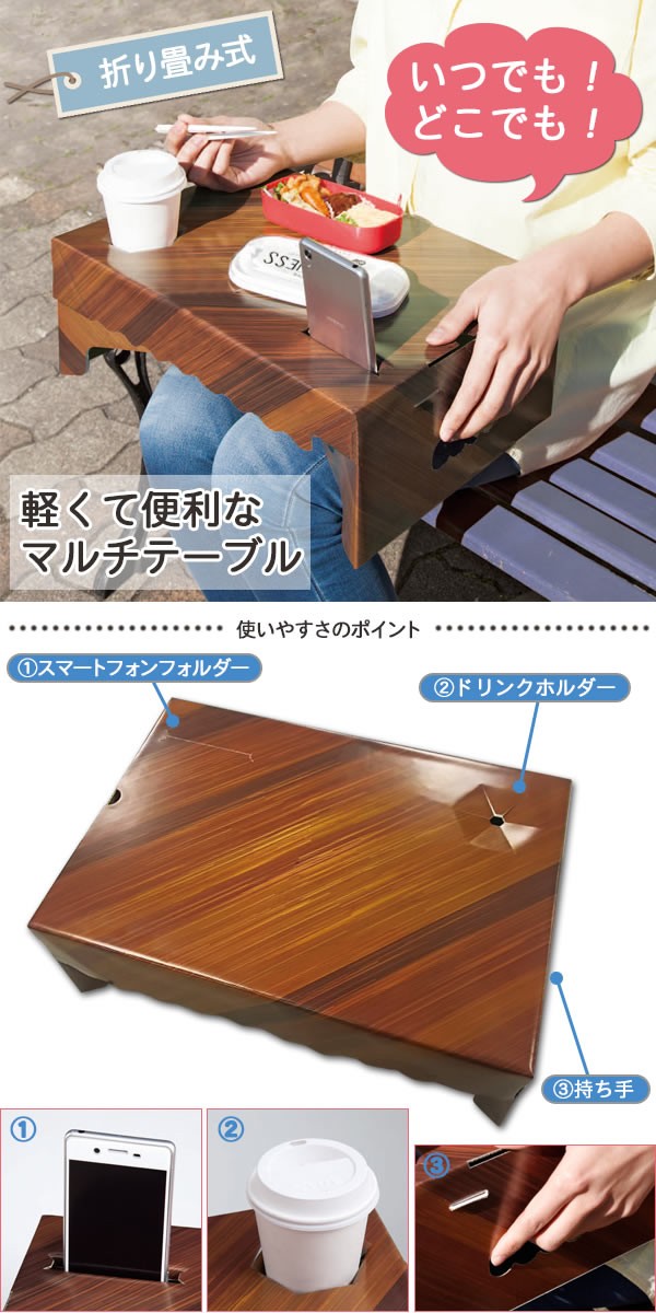 | 折りたたみの段ボール製ミニテーブルです。ソファやベッドでちょっとテーブルがほしいとき、スポーツ観戦や車内、ピクニック、出張時などで大活躍。折り畳みテーブル/レジャーテーブル/アウトドア/サイドテーブル/収納できるテーブル/コンパクト/持ち運べる/屋内/屋外 |