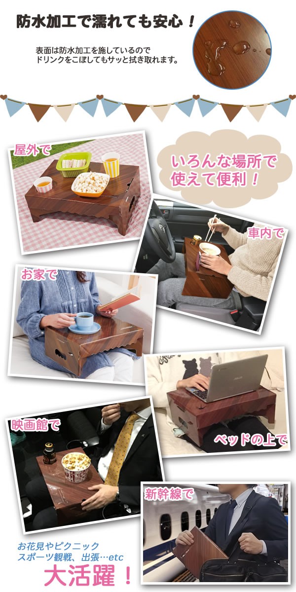 | 折りたたみの段ボール製ミニテーブルです。ソファやベッドでちょっとテーブルがほしいとき、スポーツ観戦や車内、ピクニック、出張時などで大活躍。 |