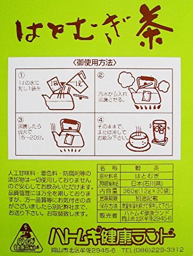 ハトムギ健康ランドで販売しておりますお茶は、インスタントではなく、すべて本物の健康茶です。 お湯に入れて、すぐに飲んでいただけるものではありません。 多少の手間と時間はかかりますが、必ず水からティーパックを入れ、沸騰したら弱火で15分から20分間煮出してからお飲みください。 そうしていただきますと、ハトムギの成分が十分お湯に溶け出します。 また、芳ばしい香りもいっそう引き立ちますので、美味しく飲んでいただけると思います。原材料・成分