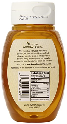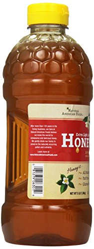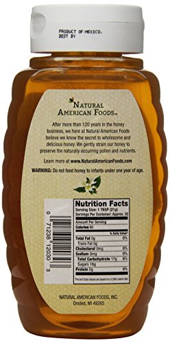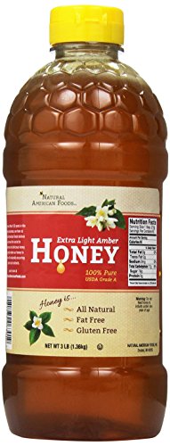 -. Binding : Grocery -. Brand : Natural American Foods -. Feature : After 120 years in the honey business we know the secret to wholesome and delicious honey. / Gently strained honey in a convenient squeezable dripless bottle / We preserve the naturally occuring pollen and nutrients / All natural,No Cholesterol, No trans-fats -. Label : Natural American Foods -. Manufacturer : Natural American Foods -. NumberOfItems : 1 -. PackageQuantity : 1 -. ProductGroup : Grocery -. ProductTypeName : GROCERY -. Publisher : Natural American Foods -. Studio : Natural American Foods -. Title : Natural American Foods Extra Light Amber Honey