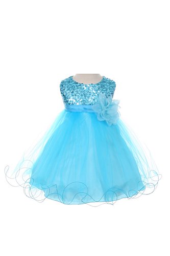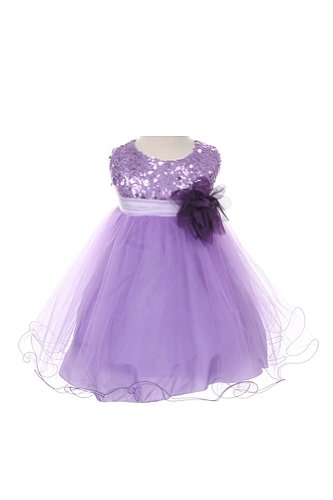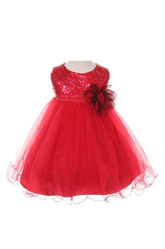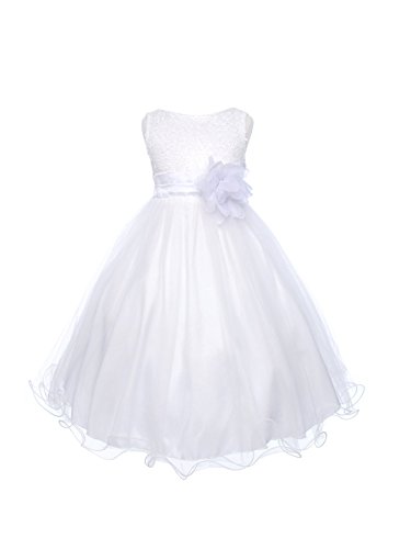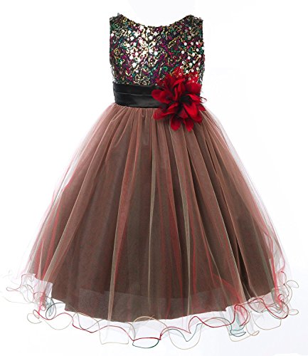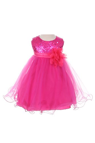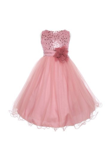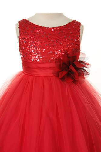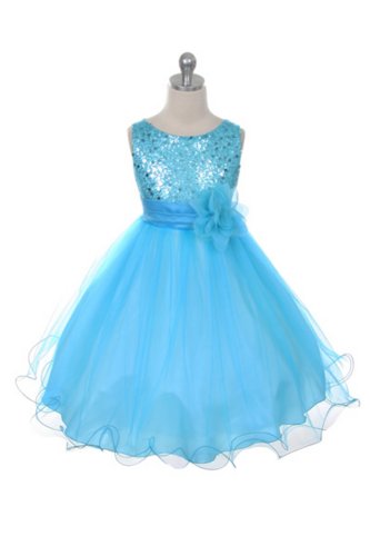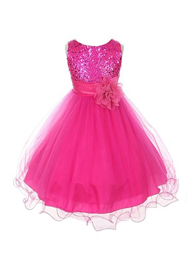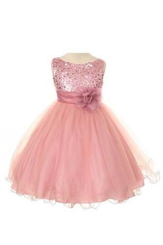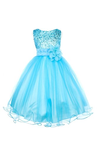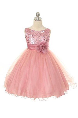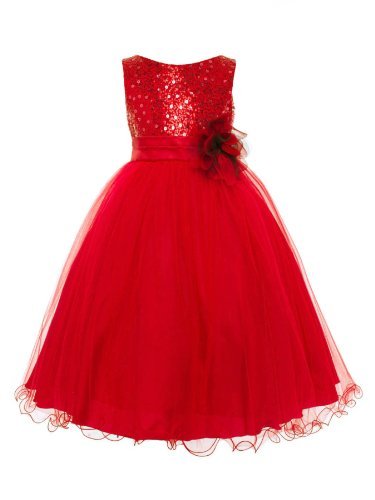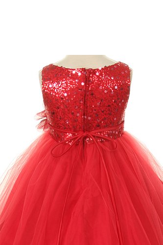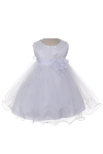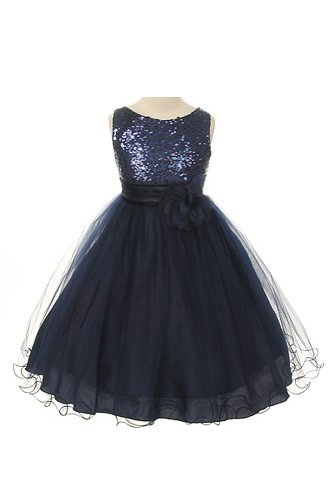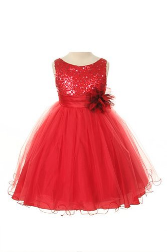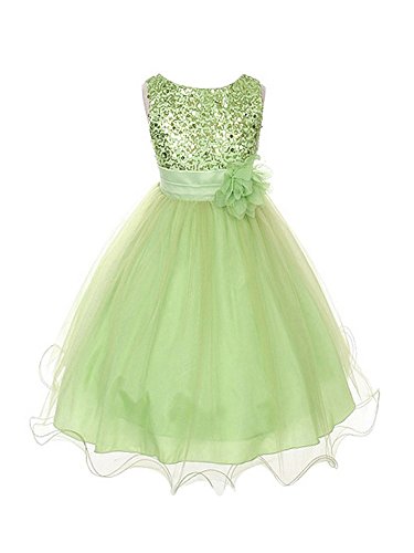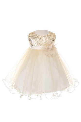 Sparkly feminine knee-length gown has a beautiful empire waist and is made with a double layered mesh finished with a gorgeous flowy double layered ruffle hemline. Fully sequined bodice is sleeveless with hidden zipper back closure and spaghetti satin tie in back. Matching mesh flower is detachable. 100% Polyester. Hand wash. Made in the USA.