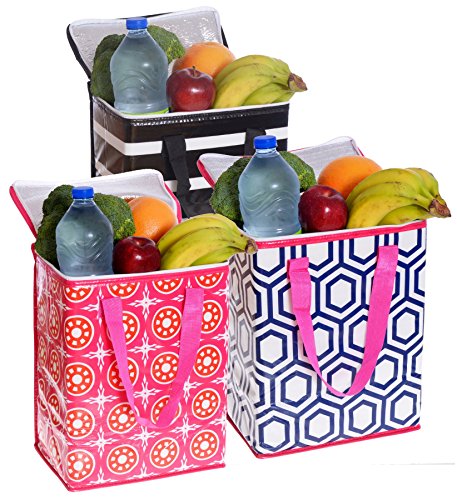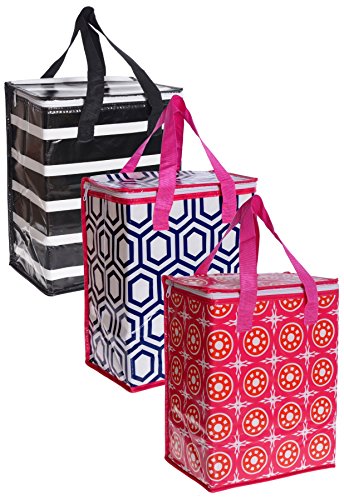 Studio : Planet E Publisher : Planet E Product Description Made of Polypropylene non-woven material, this 3 pack Keeps groceries cool or warm, great for ice cream frozen foods, meat etc. Large capacity, zipper closure for temperature control. Sturdy and heavy duty yet light material for easy storage. It comes with 3 colors/patterned lively prints 0