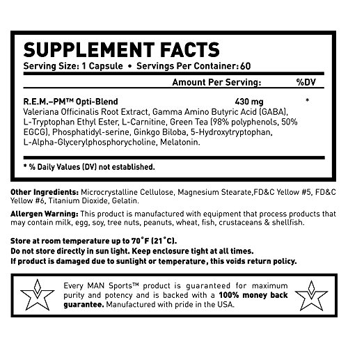-. Feature : THE BEST NIGHT TIME THERMOGENIC FAT BURNER & SLEEP AID - REM PM from MAN Sports utilizes key ingredients to provide a deep restful sleep, providing quicker recovery, fat burning and lower cortisol (stress hormone) levels. / NATURAL INGREDIENTS - MICRO-BATCH MADE! REM PM is a comprehensive formula of natural ingredients like Valerian Extract, GABA, L-Carnitine and Green Tea to increase thermogenesis while you sleep, provide you a more restful sleep and have you waking up feeling like a million bucks! All MAN Sports products produced in Micro-Batches - smaller batches, more attention to detail, in a cGMP compliant facility. / NON-HABIT FORMING SLEEP AID - The key ingredients in REM PM Nighttime Thermogenic provide a deep, restful sleep without having your body rely on it. These are premium natural ingredients that have a calming effect such as Valerian Extract, GABA, L-Tryptophan, Ginko Biloba, 5-HTP and Alpha GPC. / 100% MONEY BACK GUARANTEE! We want to make sure you're 100% happy and satisfied with your experience, so we back our products with a 100% MONEY BACK GUARANTEE.