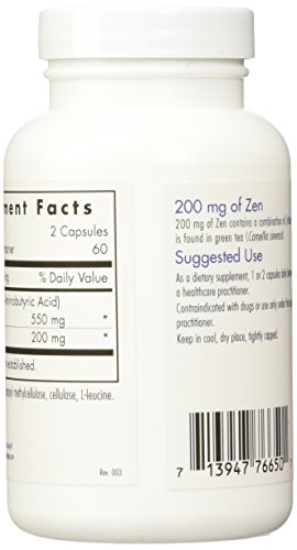 200 mg of Zen contains a combination of L-theanine and GABA. L-theanine is found in green tea (Camellia sinensis).