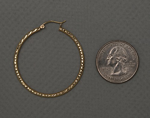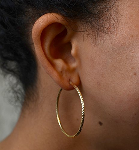 Stand out from the crowd with these dazzling 14k yellow gold sparkling hoop earrings. The shiny diamond cut detail goes all the way around the hoop so light gets reflected with your every step. And with a 1.5 inch diameter, you won't be disappointed with the size of these hoops. Perfect for a night out on the town, give your next evening outfit an extra bit of wow. A look that's dazzling, joyful, and effortless! These hoops are 14k yellow gold. They are NOT plated, but have a pure gold body with a hollow interior. Every hoop comes with an authenticated 14k stamp. Each item comes gift wrapped in LooptyHoops brand packaging with informational cards on how to wear and care for your jewelry.