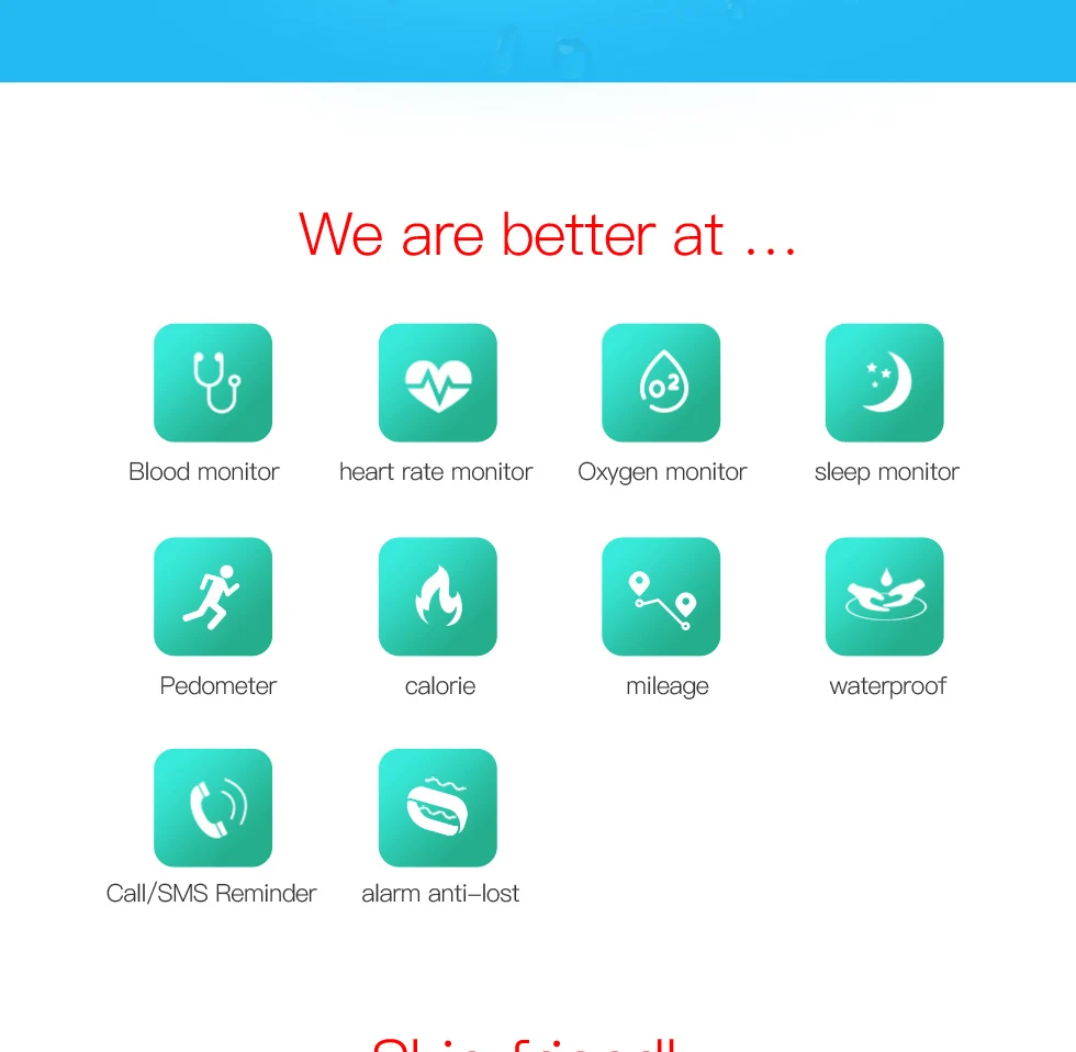Function:Blood Pressure,Passometer,Sleep Tracker,Blood Oxygen,Heart Rate Tracker,Alarm Clock,Remote Control,Activity Tracker,Fitness Tracker,Social Media Notifications,Message Reminder,Call Reminder