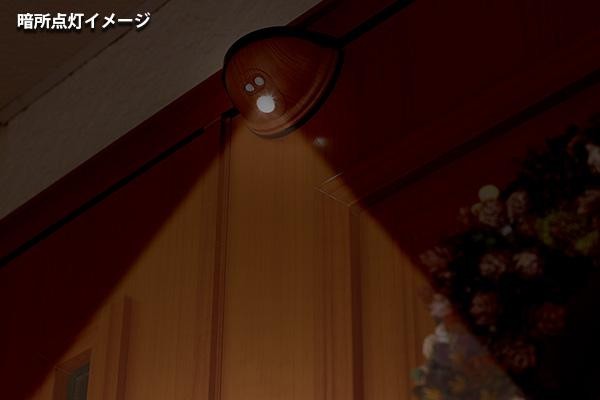 | 暗くなって人が近付くと、自動的に点灯するLEDセンサーライトです。ドア上部に挟み込む構造なので、壁などに穴を開けることなくワンタッチで設置可能です。木目調で、木製ドアの雰囲気にもぴったり合います! |