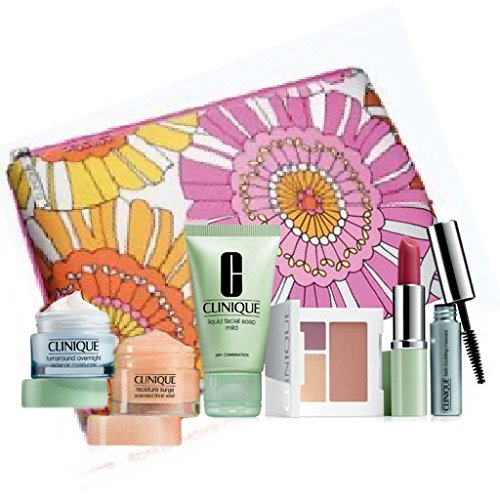 Title : Clinique New Spring 2013 Cool Colors Gift Set with 7 Daily Essentials: Turnaround Overnight Moisturizer, Moisture Surge Extended Thirst Relief, Mild Liquid Facial Soap, Colour Surge Eye Shadow Duo with soft-pressed powder blusher, Different Lipstick, Lash Doubling Mascara and a Flower Cosmetic Bag