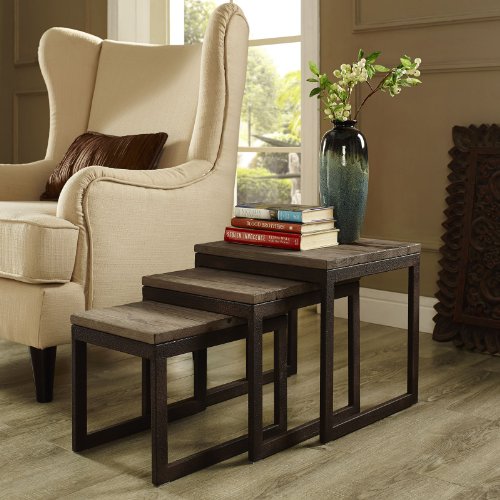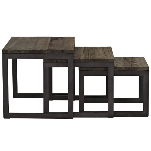 -. Feature : Set includes 3 nesting tables / Pine wood tops / Metal sled-style bases / Weathered brown wood finish / Nesting design saves space
