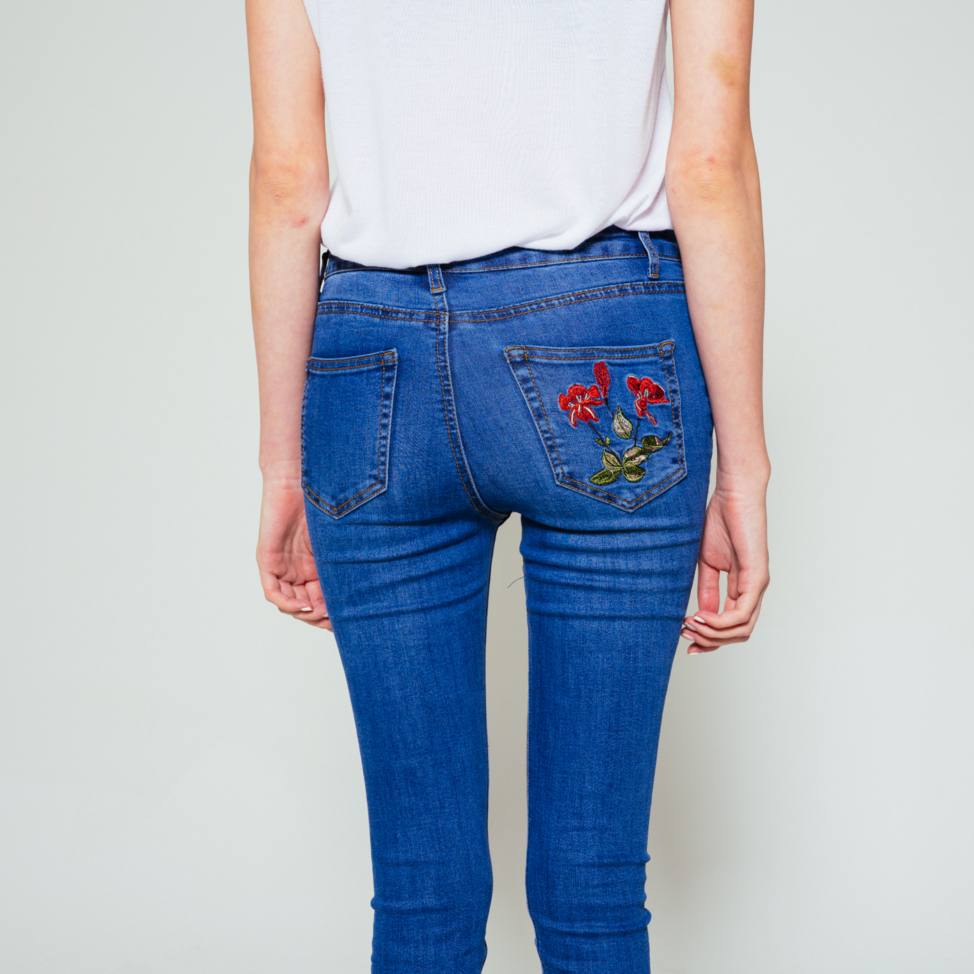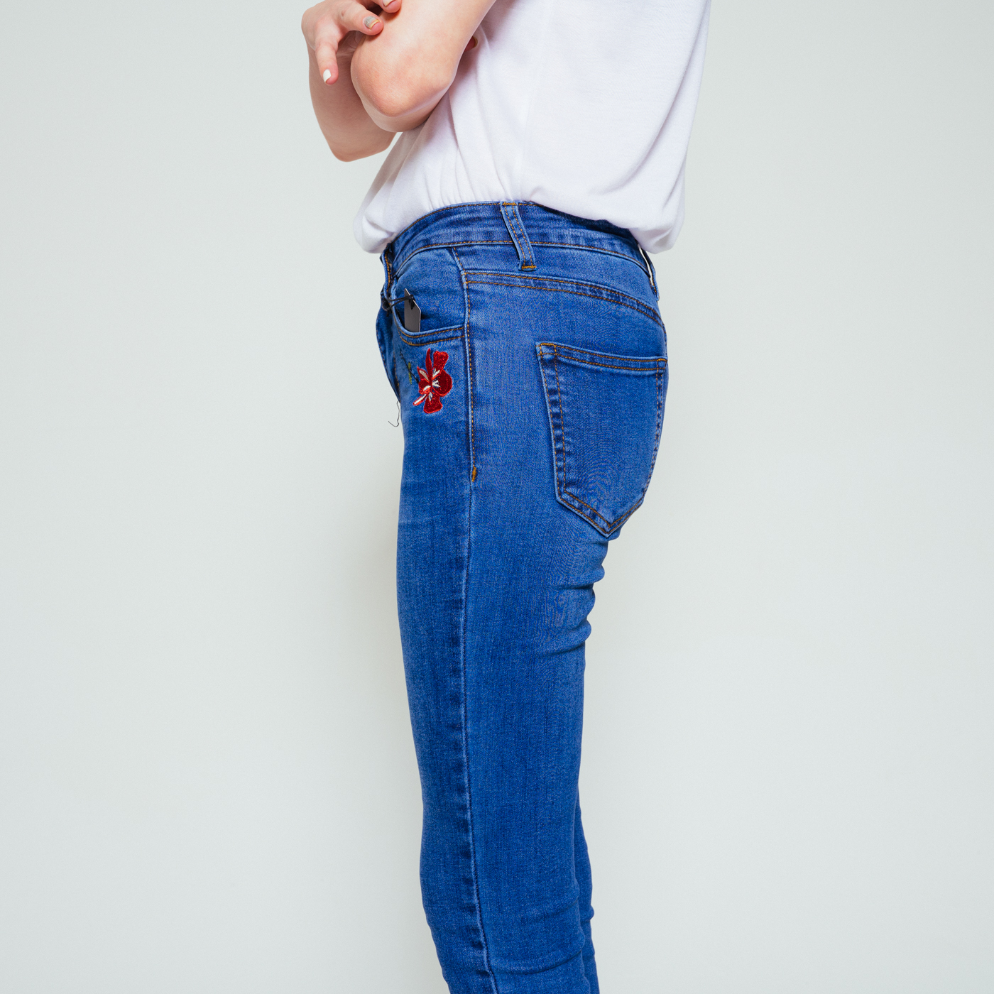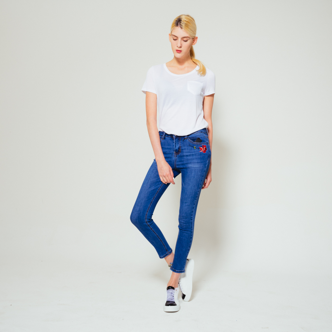 포켓자수가 예쁜 스키니 진으로 신축성이 좋습니다.
