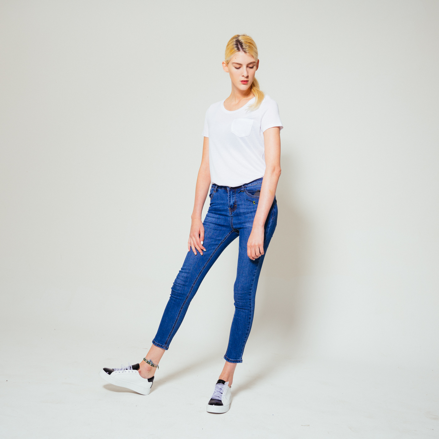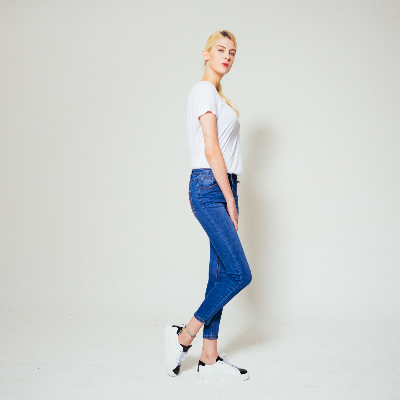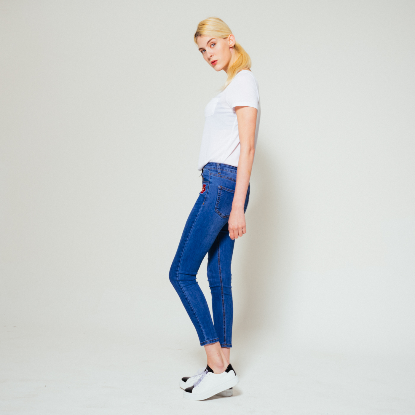 포켓자수가 예쁜 스키니 진으로 신축성이 좋습니다.