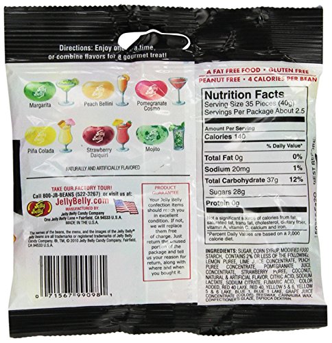 -. Feature : 3.5 oz net weight / Direct from the Jelly Belly factory / Zero fat and only 4 calories per bean / Six true-to-life cocktail flavors / No alcohol content