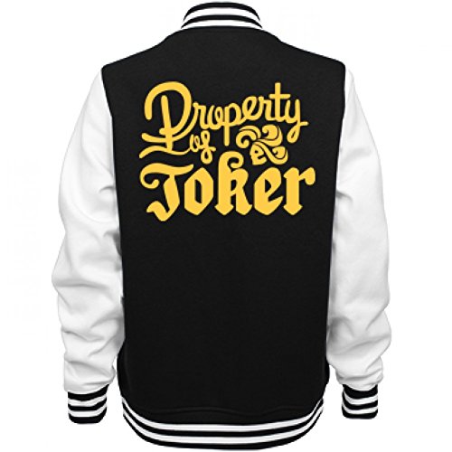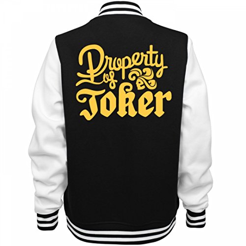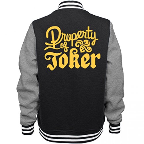 Binding : Apparel Product Description This fun and cute letterman jacket is the perfect Halloween costume if you want to be Harley Quinn this year. This 'Property of the Joker' jacket will complete your costume. Match this costume with the Suicide Squad Joker to show off your fandom. The traditional letterman jacket has been reworked in warm comfortable fleece, for a sideline winning look. 0