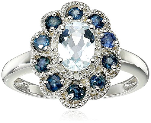 Sterling silver flower ring featuring aquamarine centerpiece framed in small diamonds and blue sapphire petals
