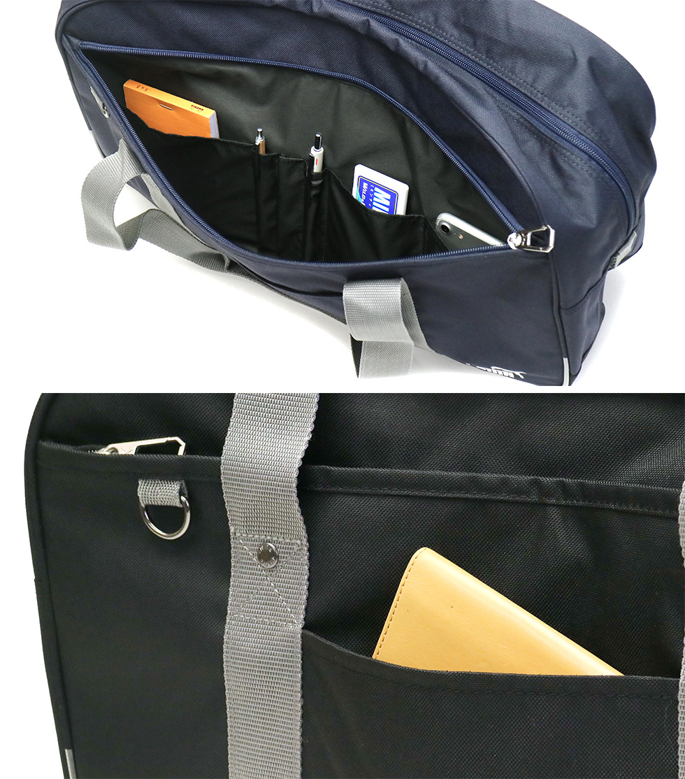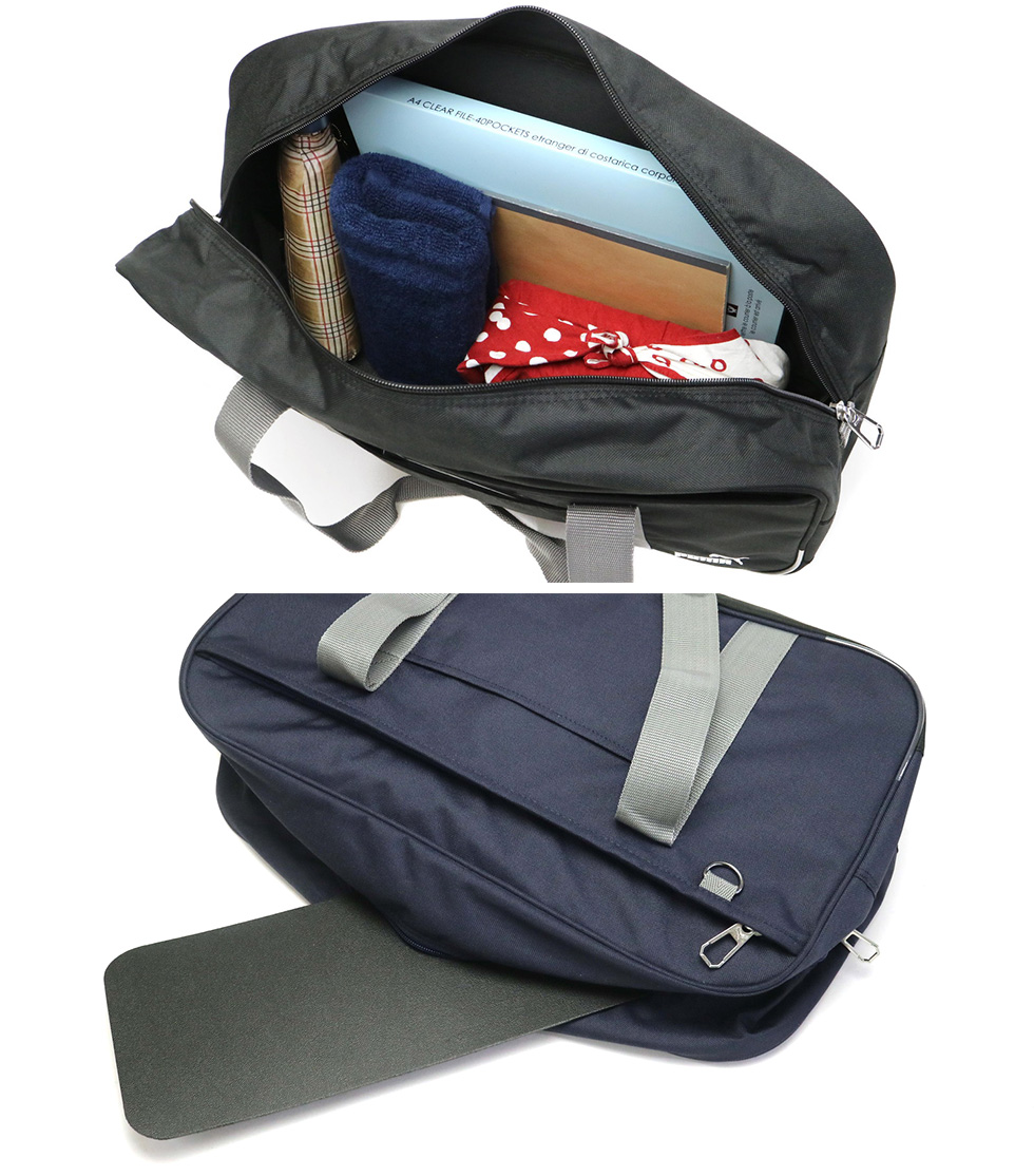 ダブルジップ開閉式のメインルームは、A4ノートが収まる定番サイズ。底板が入っているので収納しやすく、荷物が少なくても形が崩れずに持ち運ぶことができます。