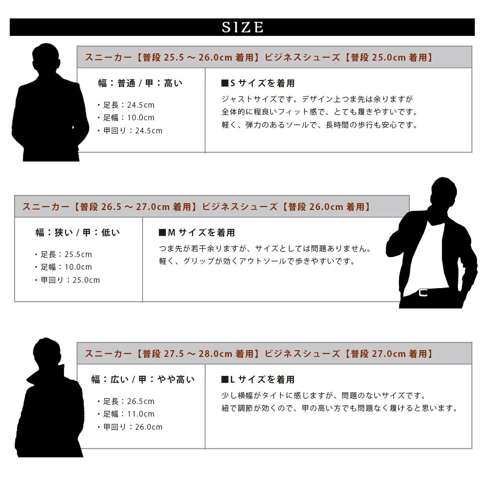 | サイズ(約:cm) | S (25.5cm-26.0cm) M (26.0cm-26.5cm) L (27.0cm-27.5cm) |
