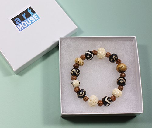 -. Binding : Jewelry -. Brand : Style-ARThouse -. Color : Brown -. Department : womens -. Feature : Carved bone and horn calls to mind native peoples creating ornaments from the natural materials around them / An interesting selection of beads is strung on a strong elastic cord / Easy to put on and easy to wear; fits the average adult woman's wrist / Comes in a nice white gift box with ARThouse logo; although variations occur, all the beads are beautiful / Made at Style-ARThouse in Maryland; comes with a title card listing materials and care instructions -. Label : ARThouse -. Manufacturer : ARThouse -. Model : JBtribalconnection -. MPN : JBtribalconnection -. PartNumber : JBtribalconnection -. ProductGroup : Jewelry -. ProductTypeName : FASHIONNECKLACEBRACELETANKLET -. Publisher : ARThouse -. Studio : ARThouse -. Title : "Tribal Connection" Carved Bone and Horn Stretch Bracelet